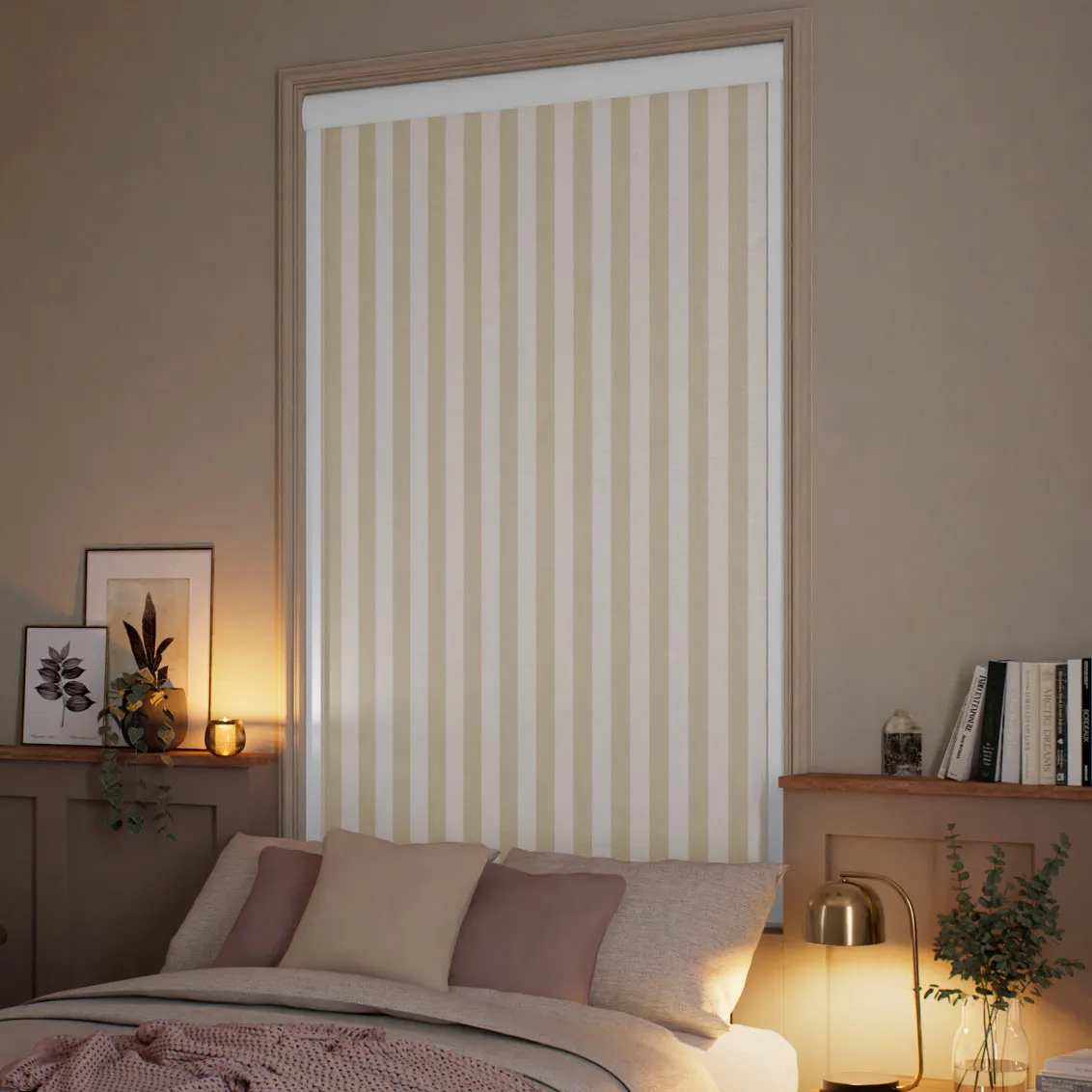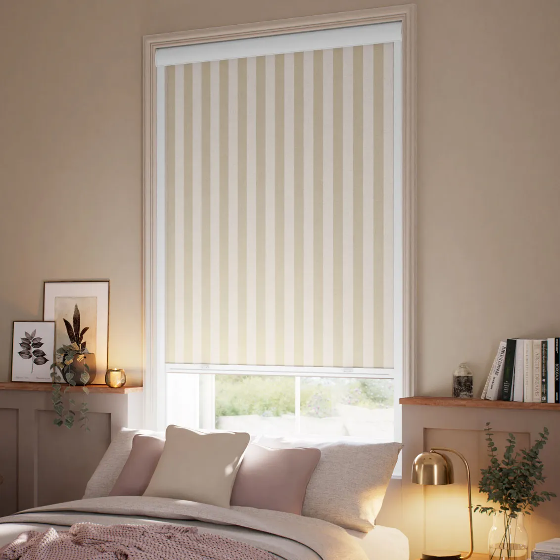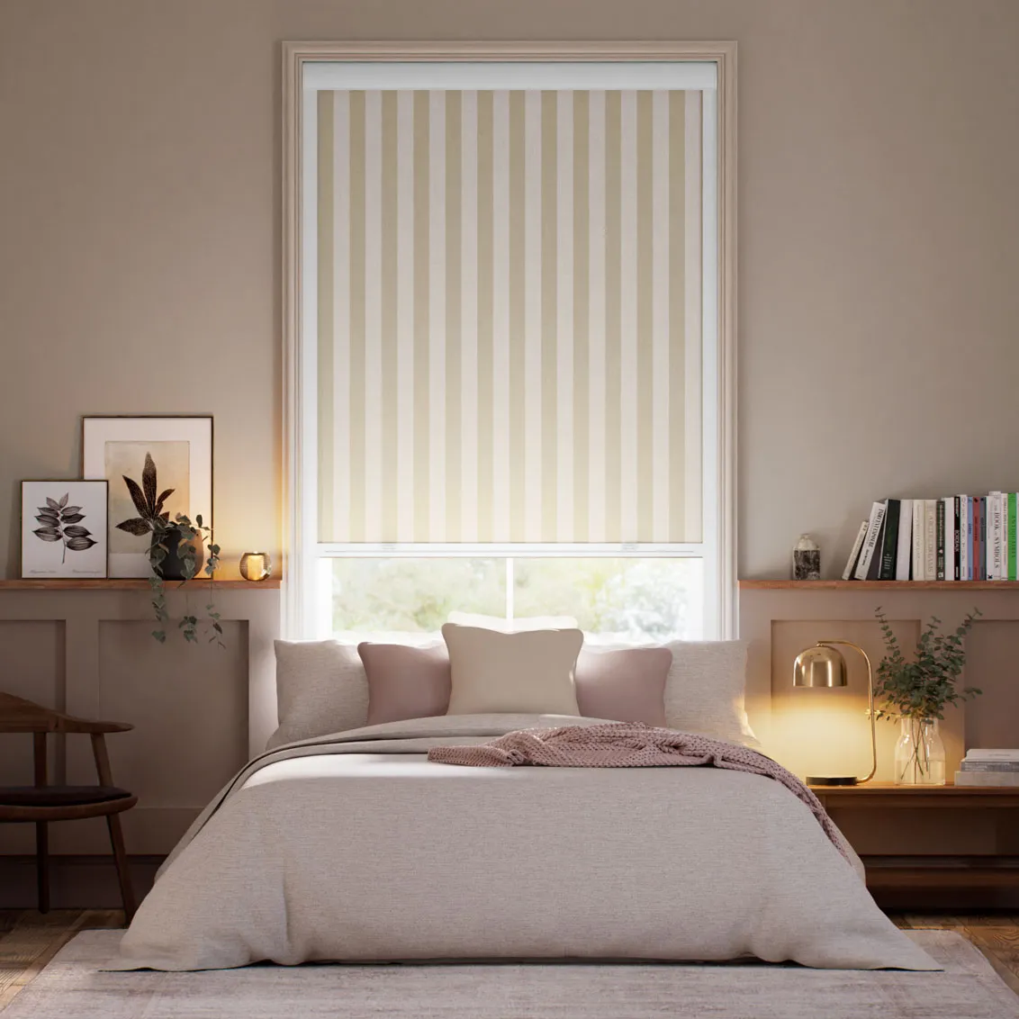 This roller blind features soft sand tones and a refined stripe design, creating a warm and timeless look for modern homes.