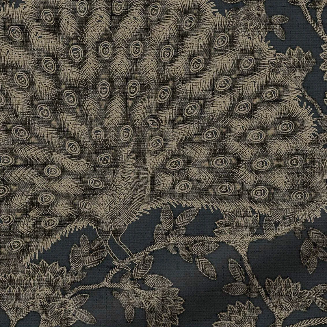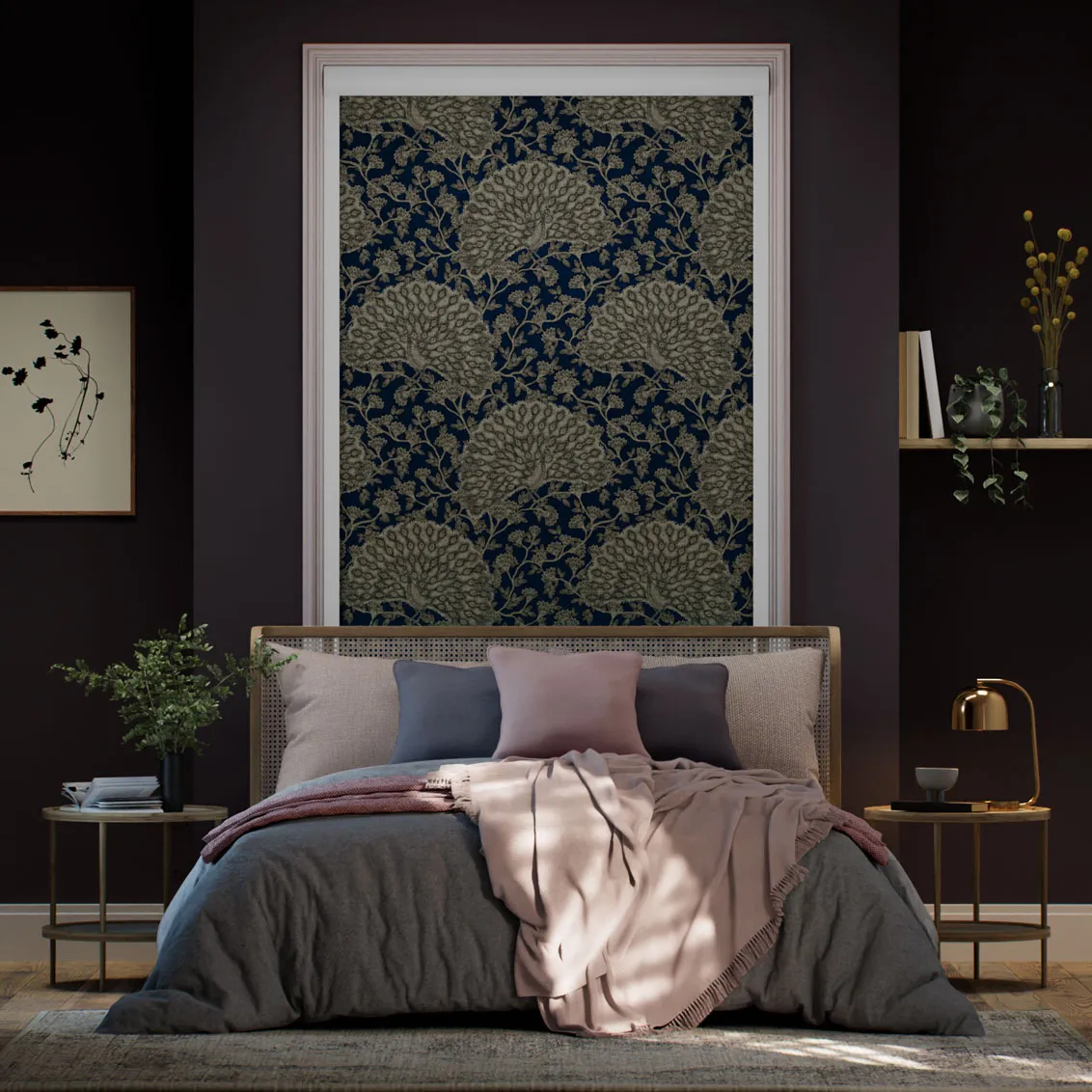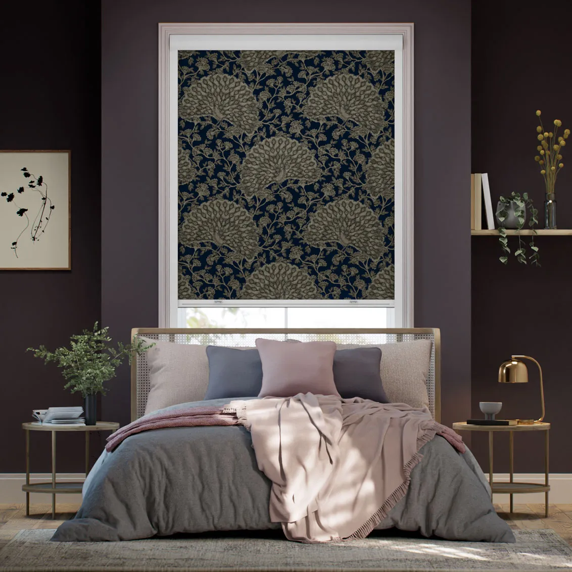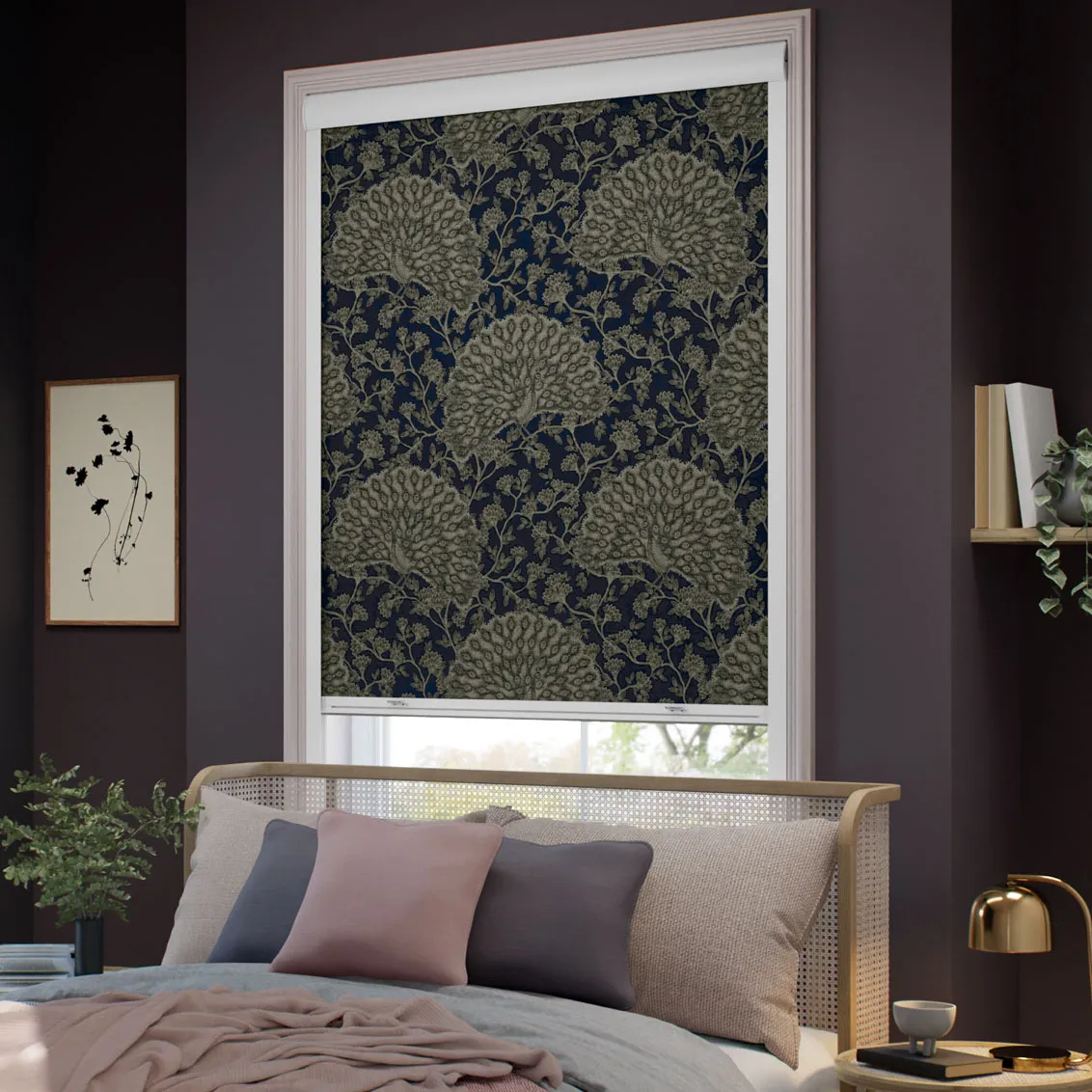 The Blackout Peacock Navy Roller Blind features a deep indigo background with intricate peacock and botanical designs, adding rich character and elegance to any room.
