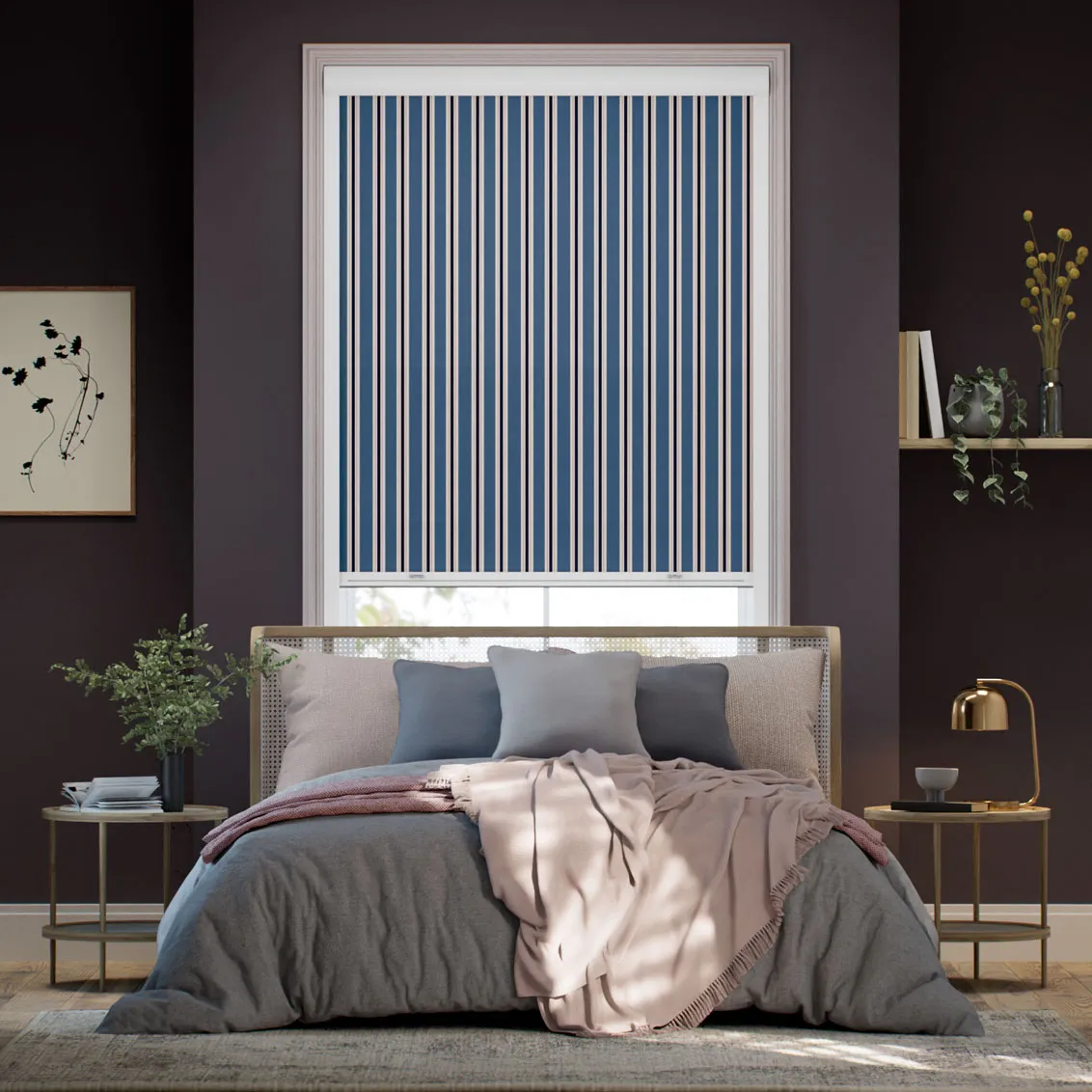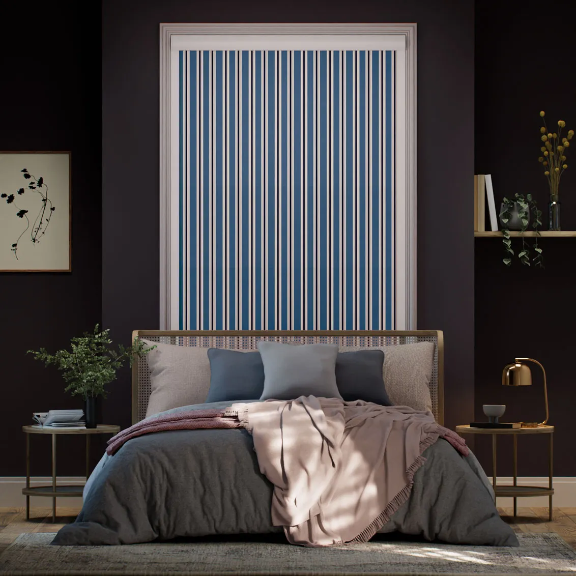 This stylish roller blind features soft blue and white stripes for a calm, modern look that suits bedrooms, bathrooms, and living spaces.